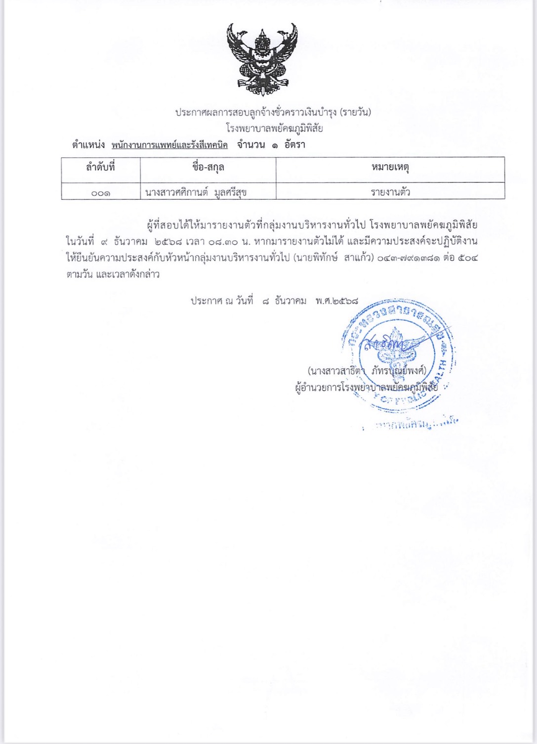 ประกาศผลการสอบลูกจ้างชั่วคราว ตำแหน่ง พนักงานการแพทย์และรังสีเทคนิค ผู้ที่สอบได้ให้มารายงานตัวที่กลุ่มงานบริหารทั่วไป โรงพยาบาลพยัคฆภูมิพิสัย ในวันที่ 9 ธันวาคม 2568 เวลา 08.30 ตามวัน และเวลาดังกล่าว